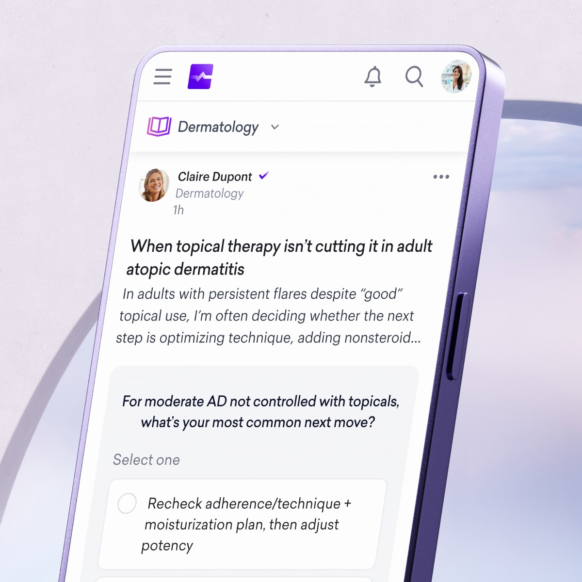 Sermo’s dermatology physician network provides practicing dermatologists with a secure, peer-driven platform to discuss advances in medical, surgical, and cosmetic dermatology. Whether you focus on general dermatology, dermatopathology, pediatric dermatology, Mohs surgery, or aesthetic procedures, Sermo connects you to peers facing similar challenges—from managing chronic inflammatory skin diseases to navigating new biologics, devices, and evolving patient expectations.